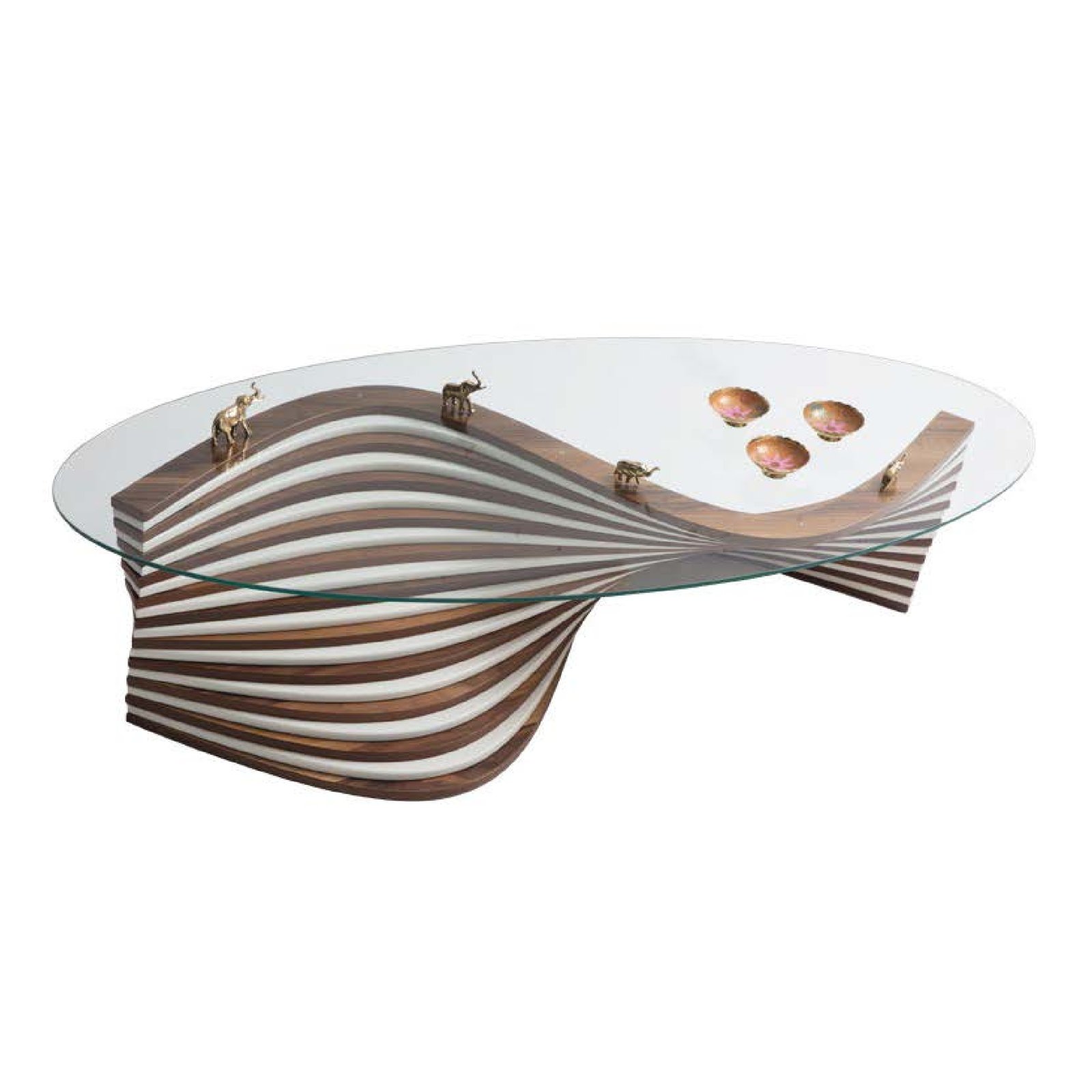 The 150 Kinglet Center Table combines elegance and functionality, available in Walnut, White, or a Walnut/White mix to complement any living room decor.