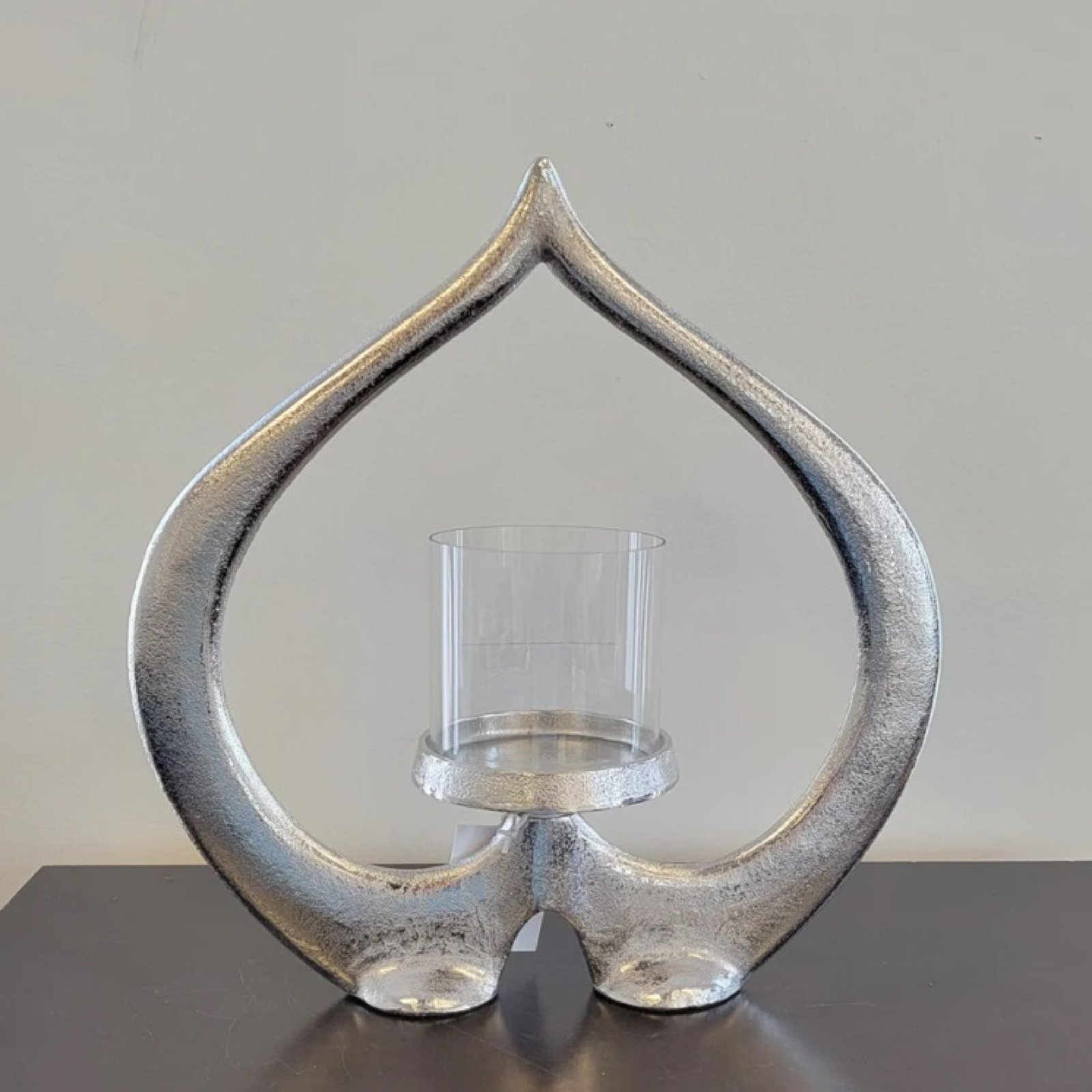 The Silver Embrace Candle & Glass Holder – Small Edition embodies the same artistic spirit as its larger counterpart. The design takes inspiration from an inverted heart, or folded hands above the head, symbolizing compassion and connection. Crafted with a smooth silver-toned metal finish, the sculpture reflects light beautifully, highlighting its abstract elegance. Despite its smaller size, the piece does not compromise on functionality. The flat base at the bottom provides a stable platform to display a candle, tealight, or even a stylish glass, making it equally practical and artistic.