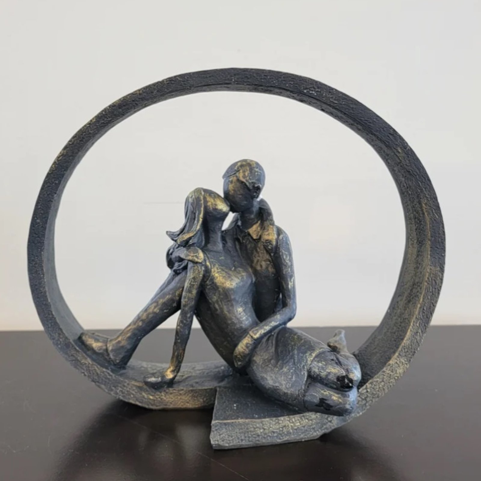 The sculpture’s circular motif, though not a complete circle, frames the couple beautifully, giving the piece a sense of continuity and wholeness. The metallic finish adds depth and elegance, highlighting the contours of the figures and the fluidity of their connection. This piece embodies more than physical closeness – it symbolizes emotional intimacy, trust, and the balance of giving and receiving in a loving relationship.