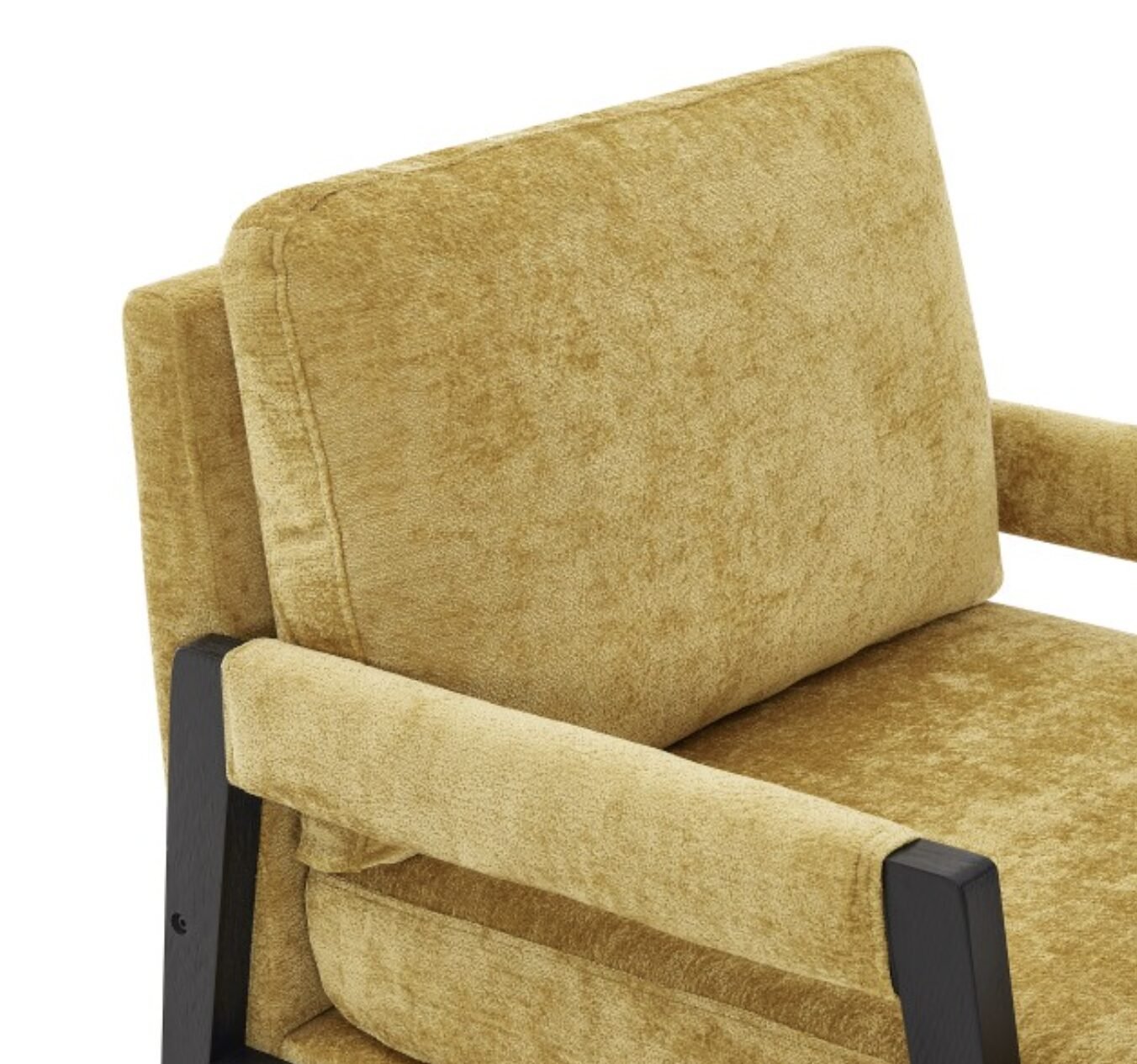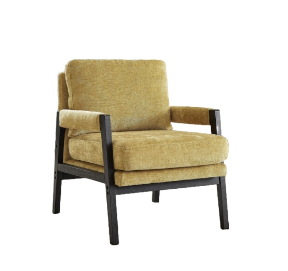 The Carlo Arm Chair in yellow combines modern design with plush comfort. Upholstered in rich chenille fabric with a sturdy wood frame, it offers a stylish and cozy seating experience for any contemporary living space.
