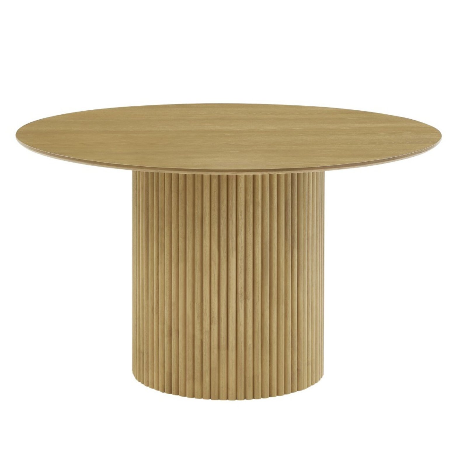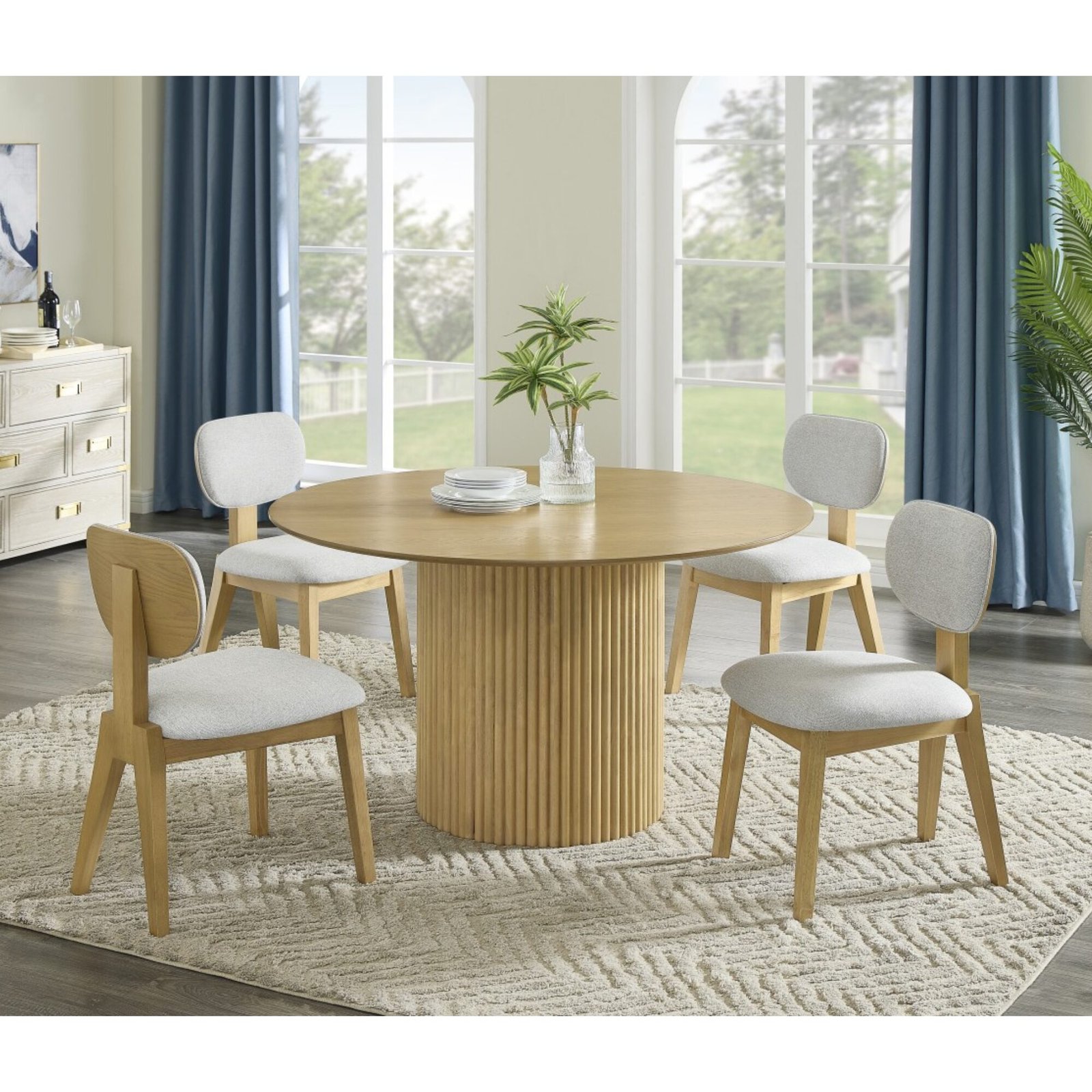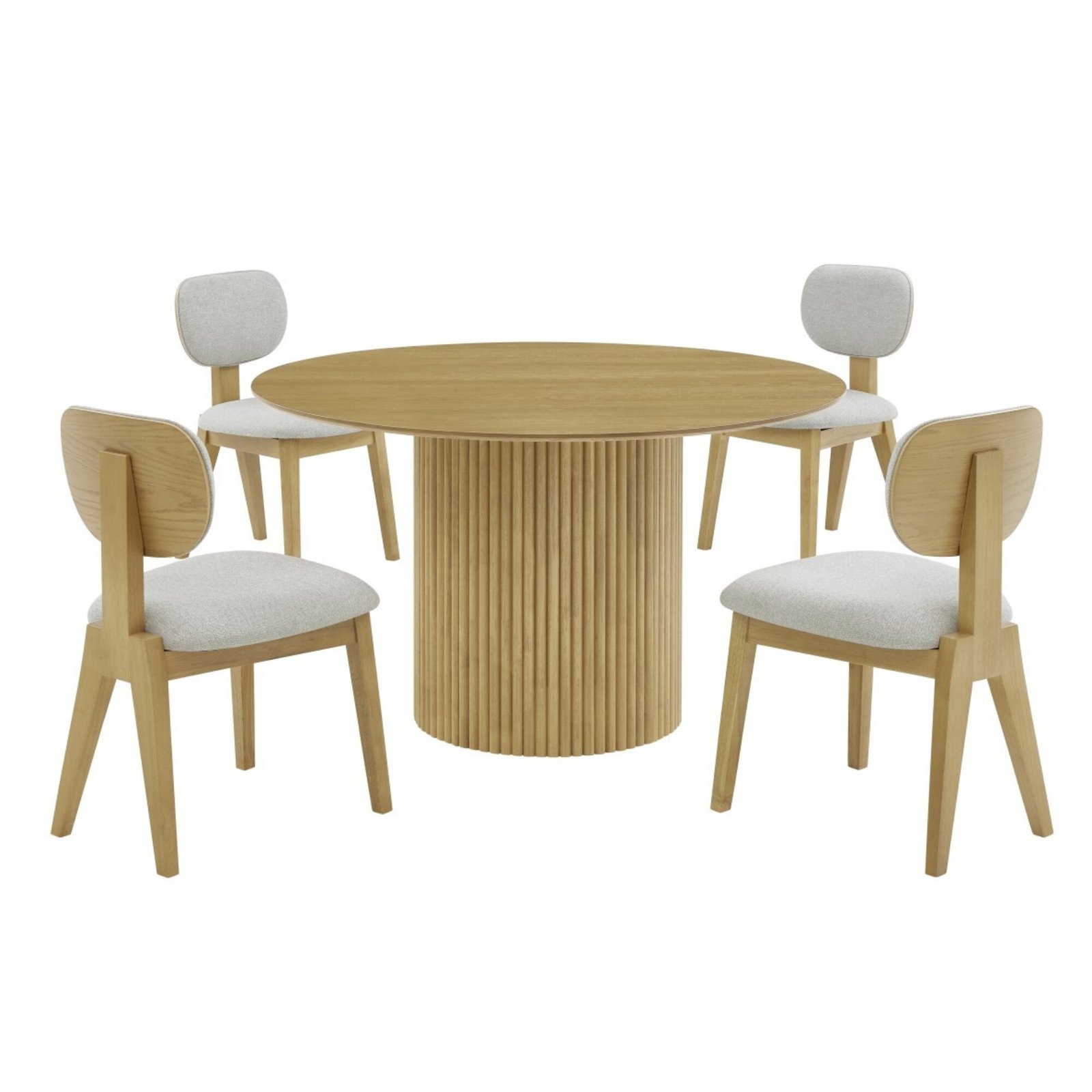 The Oscar 5-Piece Dining Set is a sophisticated blend of modern design and functionality, perfect for contemporary homes. This set includes a beautifully crafted table and four matching chairs, all designed with a minimalist yet stylish aesthetic. The table features a sleek knife-edge tabletop paired with a striking vertical grooved base that adds texture and visual appeal. The chairs are upholstered in durable, 100% polyester fabric, offering both comfort and practicality. Constructed from premium rubberwood and oak veneer, the set boasts a rich natural oak color finish, enhancing its timeless elegance. Perfect for intimate gatherings or daily meals, this dining set seamlessly combines form and function.
